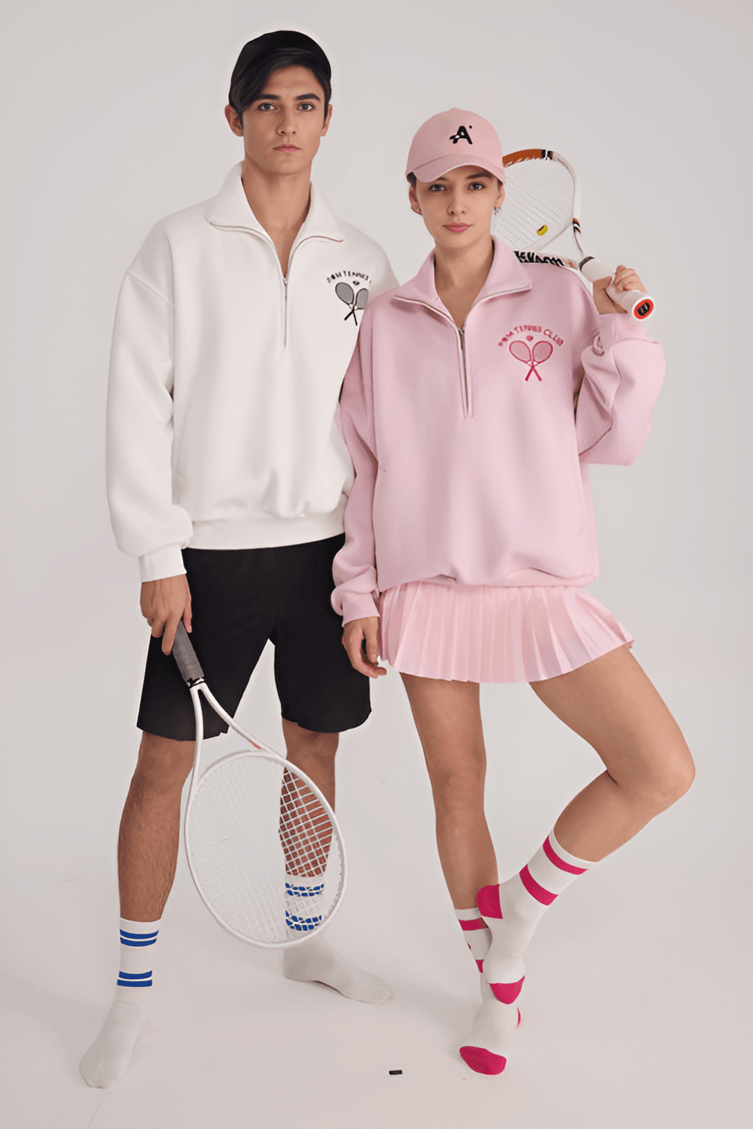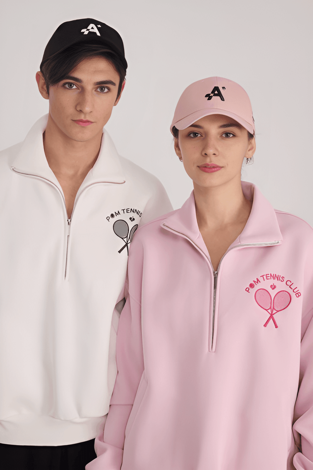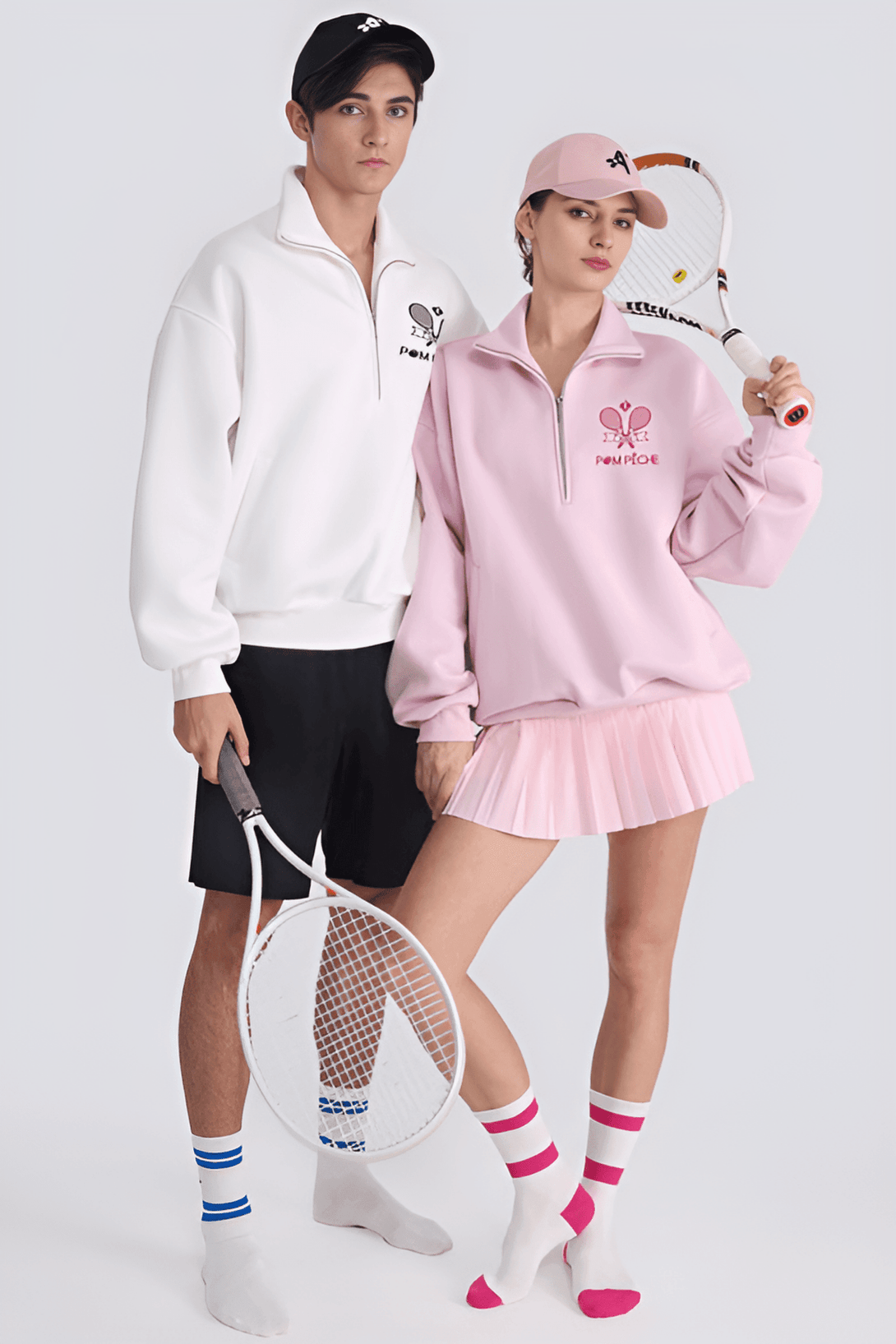 Tejido de sándwich grueso con bordado personalizado y un elegante cuello con cremallera.