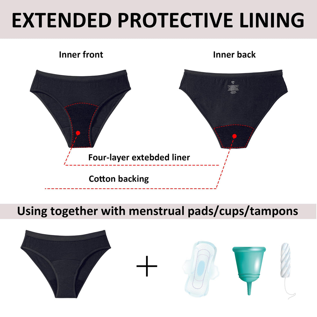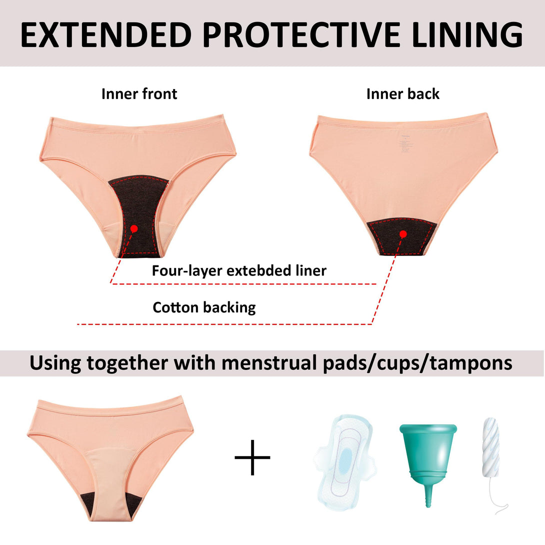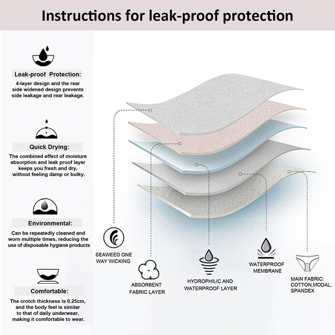 - 複数の防漏保護:これらの生理用パンティーには5つのライニングがあります:1. 海藻の一方向吸水 2. 吸収性生地層 3. 親水性および防水層 4. 防水膜 5. 主生地:コットン、モーダル、スパンデックス。また、股下のライニングを拡張しており、生理周期中の予期しない漏れによる恥ずかしさから効果的に保護します。