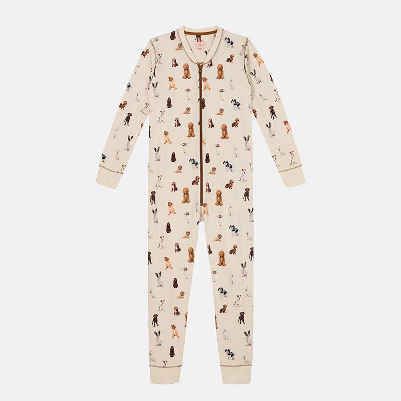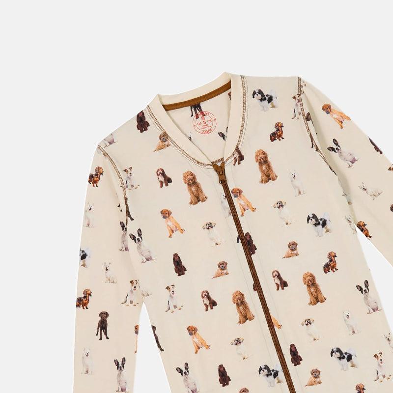 愛らしいデザイン: このロンパースは、かわいい犬と松ぼっくりのプリントを展示しており、動物と自然が好きな子供たちにとって楽しい選択肢です。これらの魅力的なデザインは、彼らの就寝ルーチンに遊び心を加えます。
