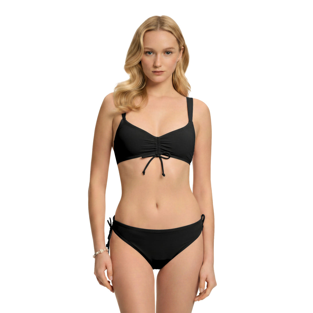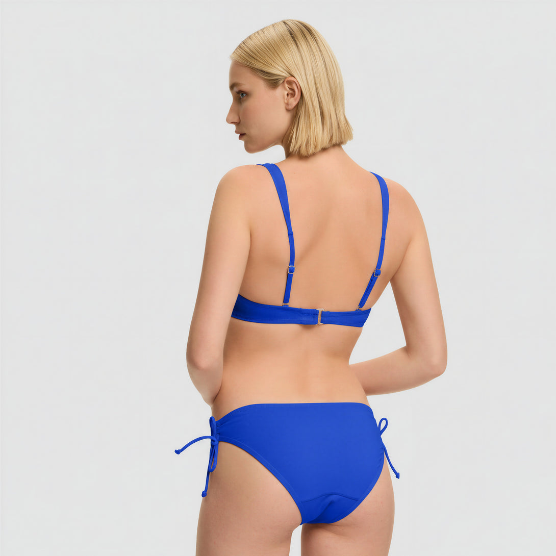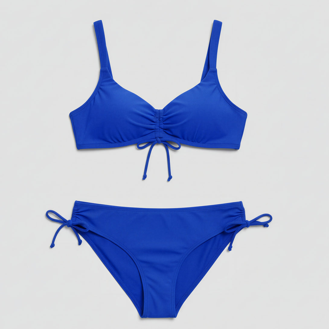 - Design: Periodebikiniens topp har justerbare brede stropper og avtagbar polstring for støtte. Brystsnoren justerer V-halsen. Sideknute og lav midje på bikinibunnen gir moderat dekning.