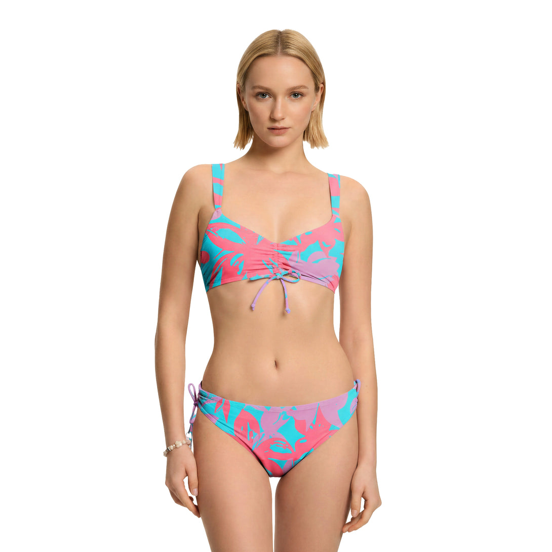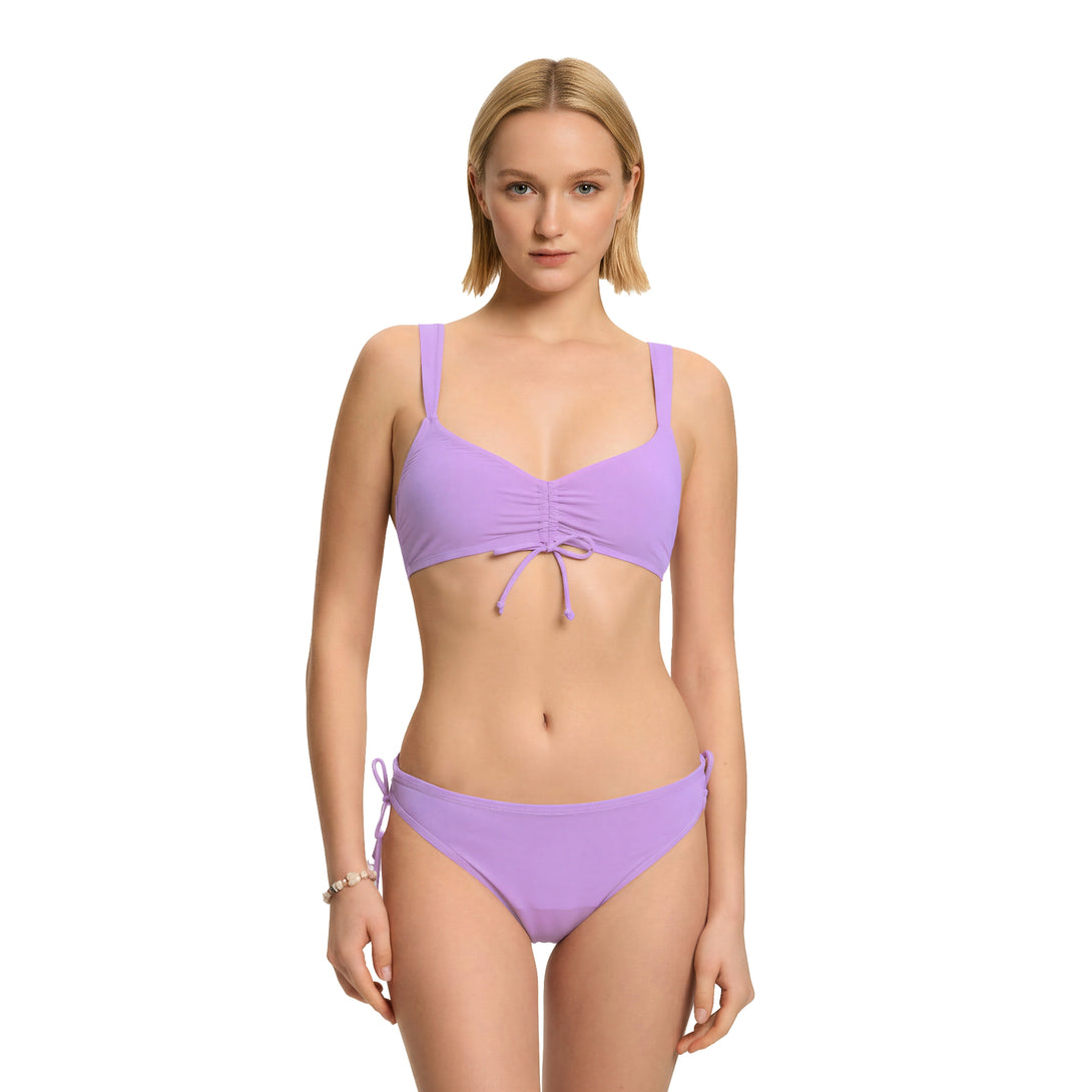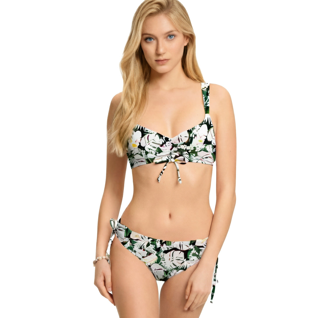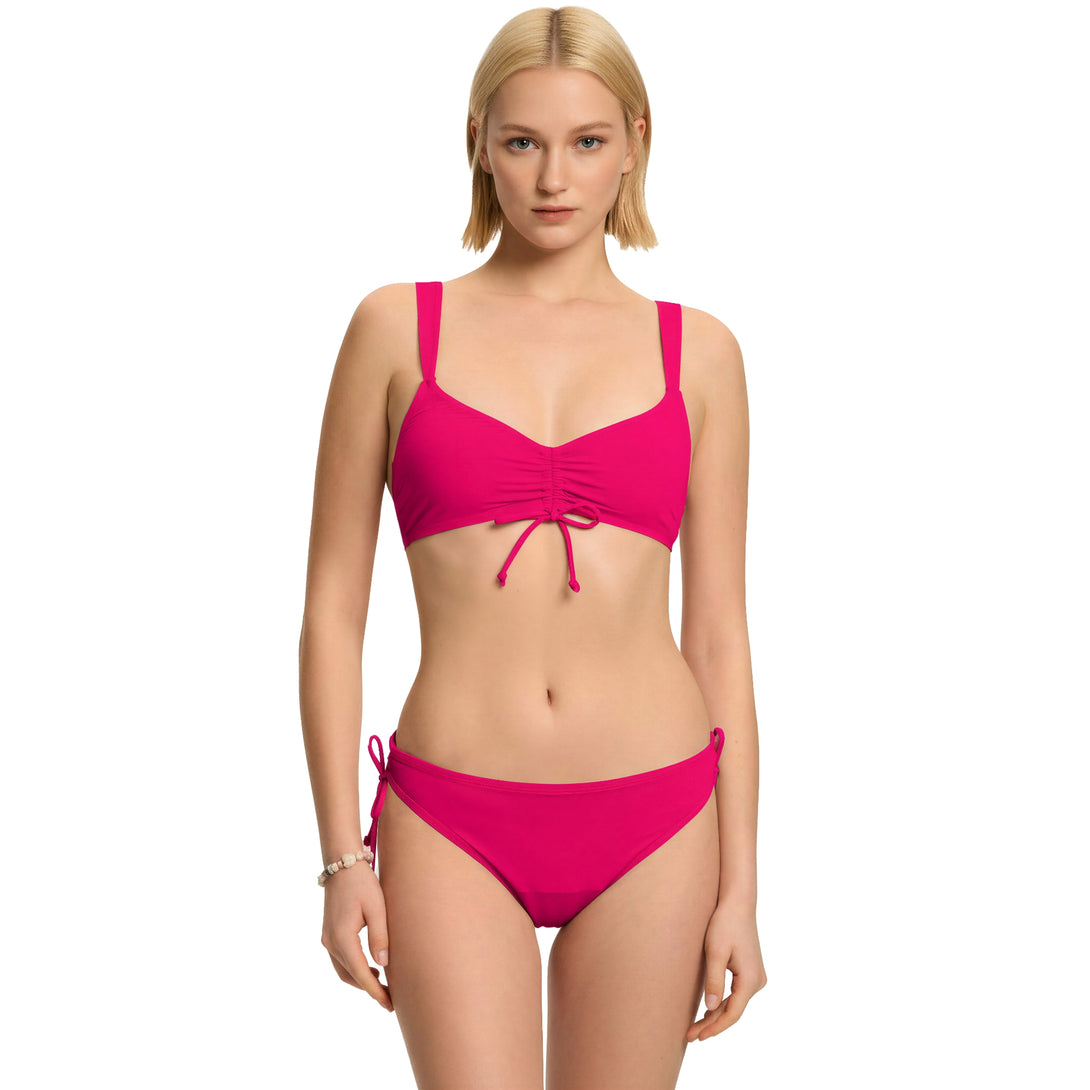- Design: Periodebikiniens topp har justerbare brede stropper og avtagbar polstring for støtte. Brystsnoren justerer V-halsen. Sideknute og lav midje på bikinibunnen gir moderat dekning.